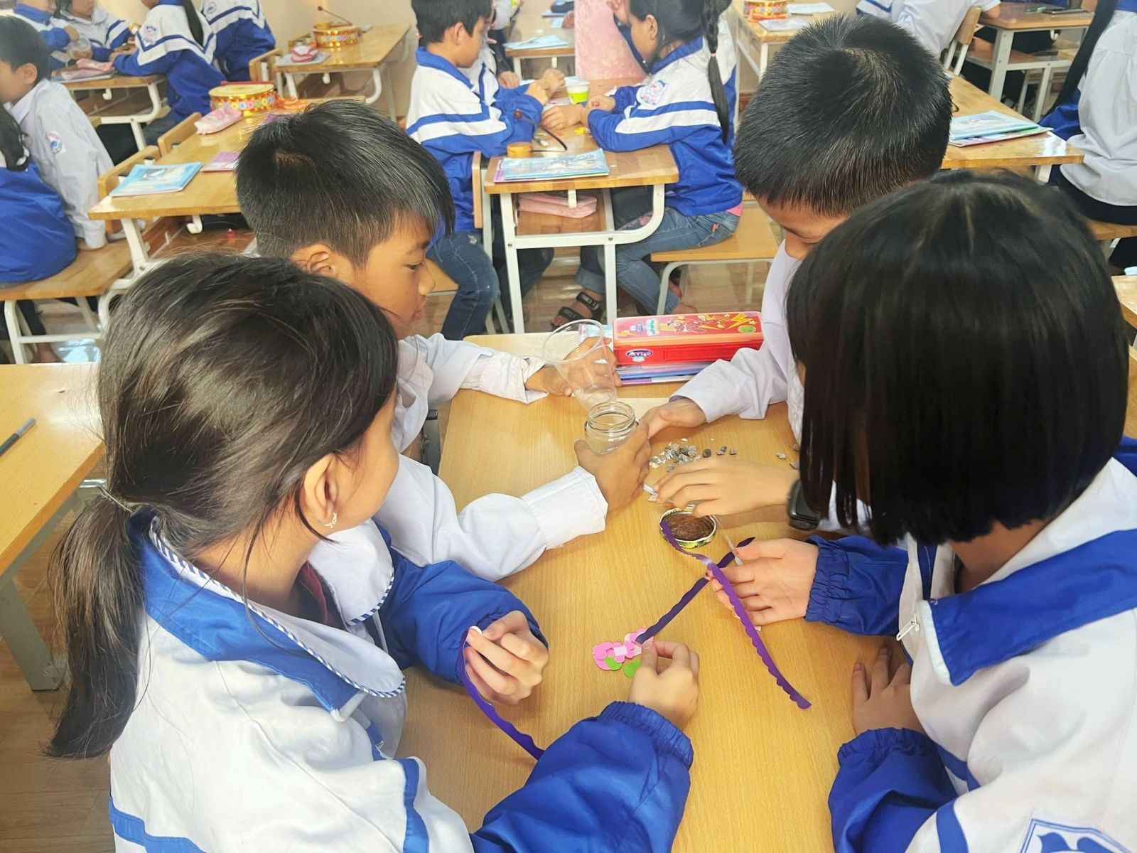 Tiết học Âm nhạc mang đến một không khí rộn ràng với bài học chế tạo “Nhạc cụ Maracas”. Đây là một ví dụ điển hình của giáo dục STEM khi kết hợp kiến thức về âm thanh (Khoa học) với thiết kế (Kỹ thuật/Mĩ thuật). Tận dụng những phế liệu như vỏ chai nhựa, lon nước ngọt cùng các loại hạt (gạo, đỗ, sỏi nhỏ), các em học sinh đã tự tay làm nên những chiếc Maracas độc đáo. Các em được trải nghiệm thực tế: lượng hạt khác nhau sẽ tạo ra âm thanh trầm bổng khác nhau.